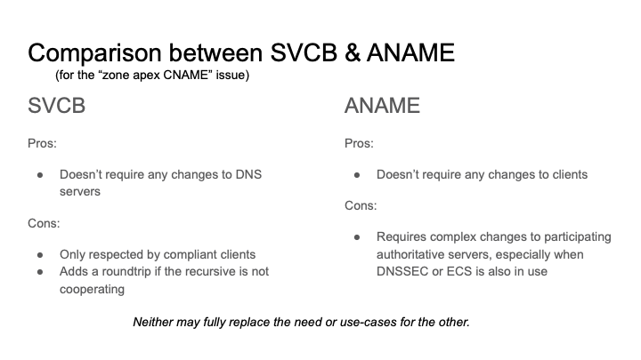 I include an image of a slide which was presented by the SVCB authors on the pros/cons between SVCB and ANAME (aka ALIAS) from an IETF long since past.